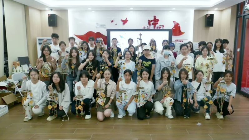 手工风铃制作环节则带来了一场诗意与治愈的邂逅,同学们在现场亲手打造专属风铃,将松果、干花、橙片等材料巧妙组合,在指尖流转中感受手工的温度。同学们在桌前专注裁剪,现场志愿者耐心示范指导。随着时间流逝,专注的眉眼下是手中逐渐成型的风铃,每一串都承载着独特的艺术。