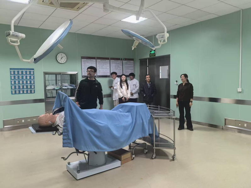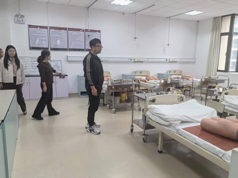 实验室建设项目负责人冀伟伟老师带领参观并介绍了健康管理学院4000平方米的专业实训中心。该实训中心下设基础医学实训中心、护理实训中心、健康服务与管理实训中心和养老服务管理实训中心。学院近期还启动了“健康管理拓展实验室建设和AI虚拟课程建设”项目,旨在通过现代技术升级实践教学条件。希望双方在实验室建设方面进行相互借鉴经验。