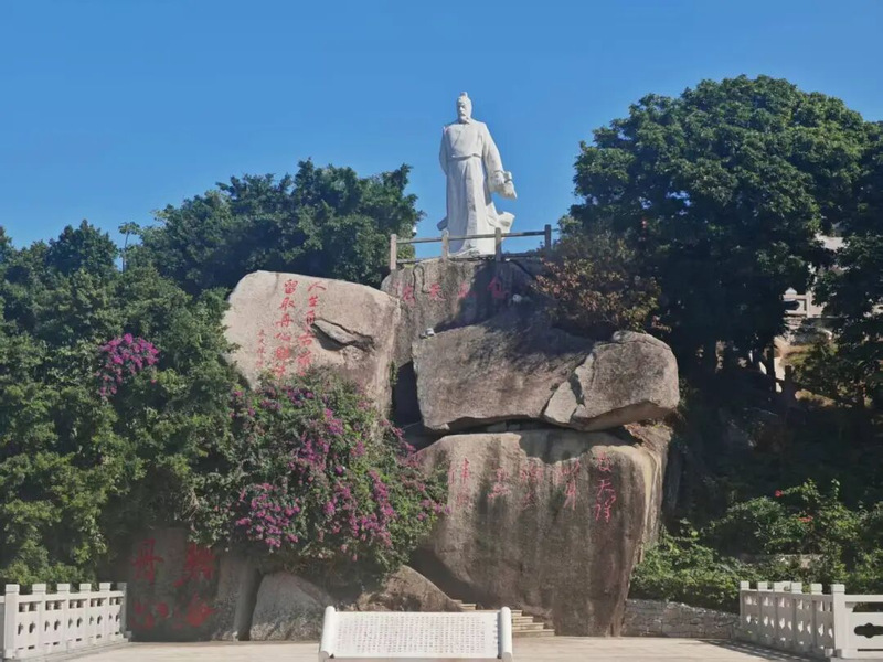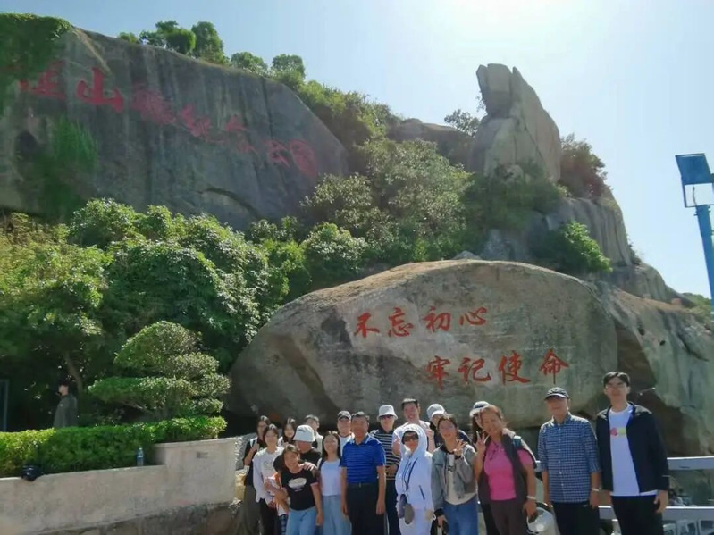 沿着石阶缓缓上行,先映入眼帘的是黑色大理石铭文,镌刻着万山海战的壮烈历程,功臣名单在阳光下熠熠生辉,每一个名字都仿佛在诉说着那段烽火岁月;终点处巨型岩石上“不忘初心、牢记使命”八个鲜红大字,与碧海蓝天相映成景,让师生在回望历史中坚定前行方向。