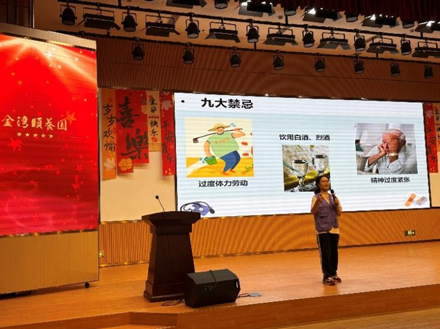 理论讲解环节,团队坚持循证、科学、实用原则,依托PPT系统讲解核心知识。防跌倒宣讲从内在体质、外在环境两大维度,详细介绍环境改造、合理运动、安全用药等防控措施,重点示范“起床三部曲”等实用技能;高血压科普围绕疾病定义、血压分级、常见误区与干预要点展开,强调低盐饮食、规律服药、定期监测的重要性。活动期间,遵义医科大学第五附属(珠海)医院医护团队全程提供专业指导,确保科普内容权威严谨。